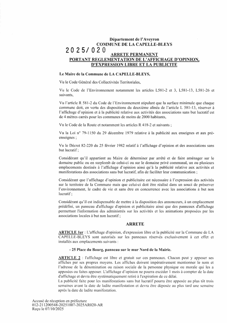 Voici l’arrêté permanent portant réglementation de l’affichage d’opinion, d’expression libre et la publicité.