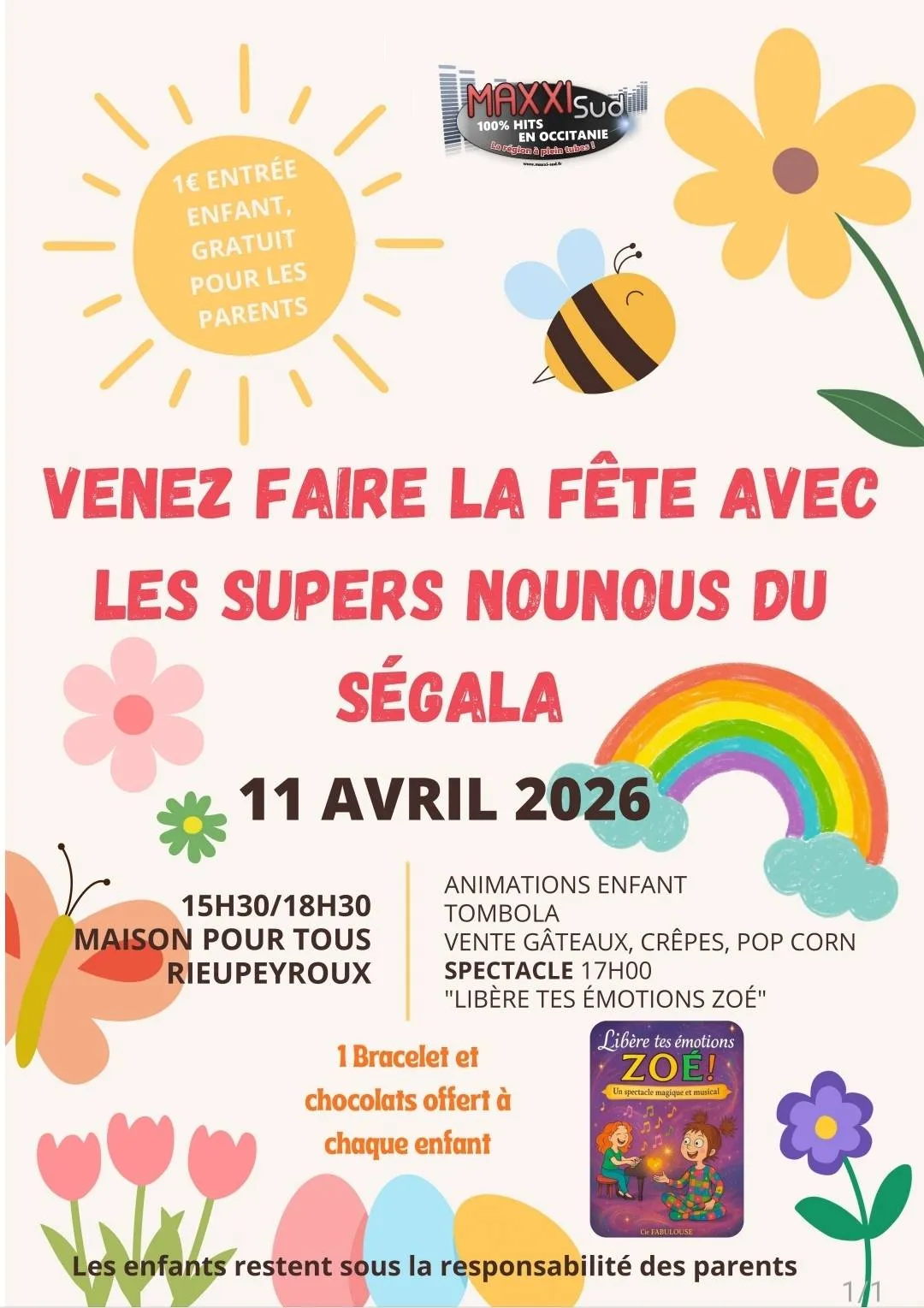 Venez faire la fête avec les supers nounous du Ségala !Animations enfant, tombola, vente gâteaux, crêpes, pop corn, spectacle à 17h « Libère tes émotions Zoé »